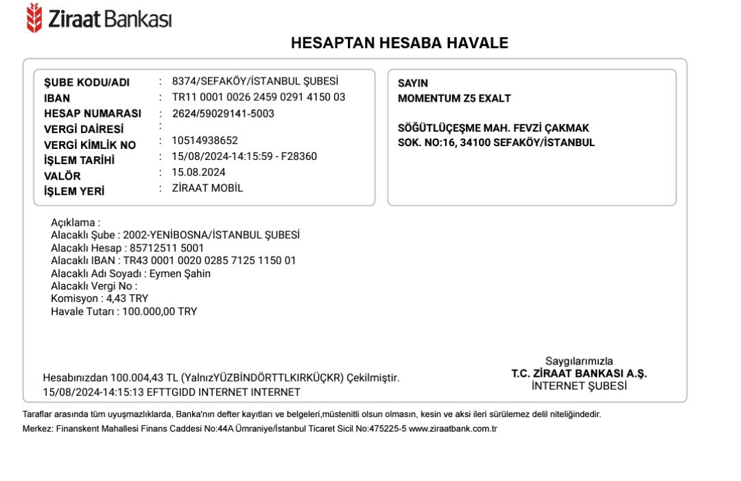 Tüm hafta boyunca Momentum z5 Exalt platformundaki bakiyemi kontrol etmedim. Bu biraz zordu, çünkü paramın artık orada olmamasından korkuyordum. Daha sonra hesabıma geri döndüğümde şunu gördüm: tüm anlaşmaların neredeyse %85'i iyi bir kâr sağladı. Diğer %15'i ise başarısız olmuştur. Bununla birlikte, karşılığını kolayca aldı. Artık bakiyemde 135.400TL vardı! Ben de eşime hediye almak için 100.000TL çektim. Para gerçekten hızlı bir şekilde, bir saat içinde transfer edildi ve geri kalan miktar bana gelir getirmeye devam etti. İşte banka hesap özeti: